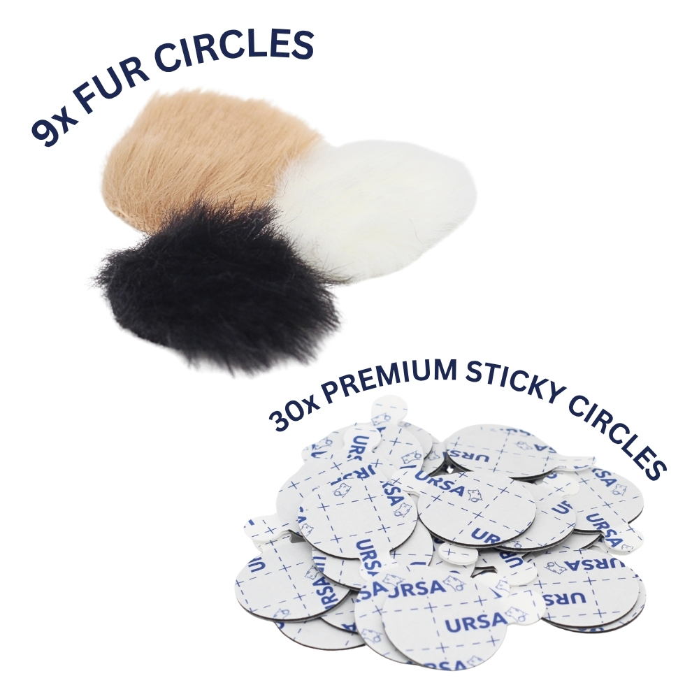 9 Long furs (3 of each colour) for protection against moderate wind which are resusable and supersoft to reduce clothing rustle. Pack includes 30 sticky circles.