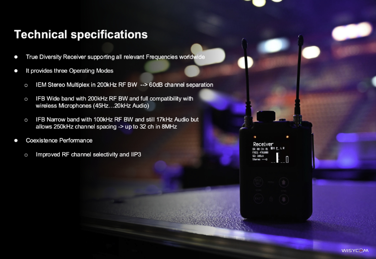 Wisycom provides the best in-ear monitoring systems for the pro audio market. We do not settle when it comes to RF Robustness, RF Agility and RF Efficiency, Audio quality, Channel separation, and many more features that give the users the most reliable IEM solution on the market. We therefore took the established reference and refined it even further.